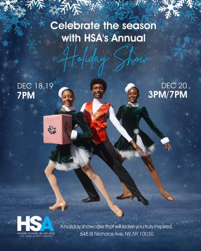 This year’s Holiday Show is a vibrant celebration of the extraordinary talents of HSA students across Dance, Music, Art & Design, and Spoken Word. Directed by HSA Dance and Artistic Director Leyland Simmons, the 2025 Holiday Show invites audiences on a captivating journey through the rich cultural landscape of Harlem, New York.